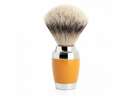 Kwast van Silvertip dassenhaar. Butterscotch, serie Stylo van MÜHLE. 21 mm, maat M. Scheerkwast gemaakt van Silvertip dassenhaar. Handvat is van gepolijstedelhars. De onderkant van het handvat is van verchroomd messing. Silvertip dassenhaar is de fijnste haarsoort mogelijk voor handgemaakte scheerkwasten. De speciale kenmerken zijn de glanzende zilveren kleur aan de punt en een zwarte band die door het haar loopt. Het haar is zeer zacht en heeft een subliem schuimend vermogen. Het wordt gebruikt om duurzame, kwalitatief hoogwaardige en unieke scheerkwasten met uitstekende prestaties te maken. De conisch gevormde Stylo-lijn combineerd een klassiek design met een moderne twist.