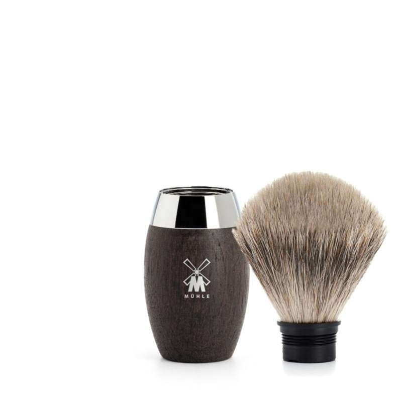 Scheerkwast van zuiver Fijndas. Moeraseik, serie Kosmo van MÜHLE. 21 mm, maat M. Moeraseik is eigenlijk geen houtsoort, maar komt uit hout dat vele eeuwen geleden in moeras is gevallen waar het verschillende veranderingsprocessen heeft ondergaan. Een expressieve, donkere kleur is ontstaan door de tannines in de moeras. Fijndas is iets stugger dan Silvertip Dassenhaar. Een onderbuik van een das bestaat uit zo’n 20 tot 25% van deze haren. Om de typische vorm te verkrijgen, wordt de kroon lichtjes bijgesneden waar nodig. Een prima haar met uitstekende prestaties. De haren van de kwast zijn vervangbaar door een schroefmechanisme. De kosmopoliet heeft centraal gestaan voor het ontwerp van de Kosmo-productlijn. De moderne serie met haar tijdloze ontwerp en ergonomische vormgeving is ideaal voor de goed geschoren reiziger. Mooi maar ook praktisch.