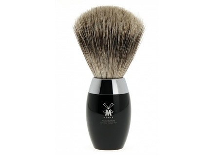 Scheerkwast van zuiver Fijndas. Zwart, serie Kosmo van MÜHLE. 21 mm, maat M. De kwast is aan de top licht bijgesneden om de typische vorm van de kwast te verkrijgen. Handvat is gemaakt edelhars, een zeer duurzaam materiaal. Het bovenste gedeelte van de greep is gemaakt van messing wat eerst wordt verzinkt en vervolgens afgewerkt met chroom. Fijndas is iets stugger dan Silvertip Dassenhaar. Een onderbuik van een das bestaat uit zo’n 20 tot 25% van deze haren. Om de typische vorm te verkrijgen, wordt de kroon lichtjes bijgesneden waar nodig. Een prima haar met uitstekende prestaties. De haren van de kwast zijn vervangbaar door een schroefmechanisme. De kosmopoliet heeft centraal gestaan voor het ontwerp van de Kosmo-productlijn. De moderne serie met haar tijdloze ontwerp en ergonomische vormgeving is ideaal voor de goed geschoren reiziger. Mooi maar ook praktisch.