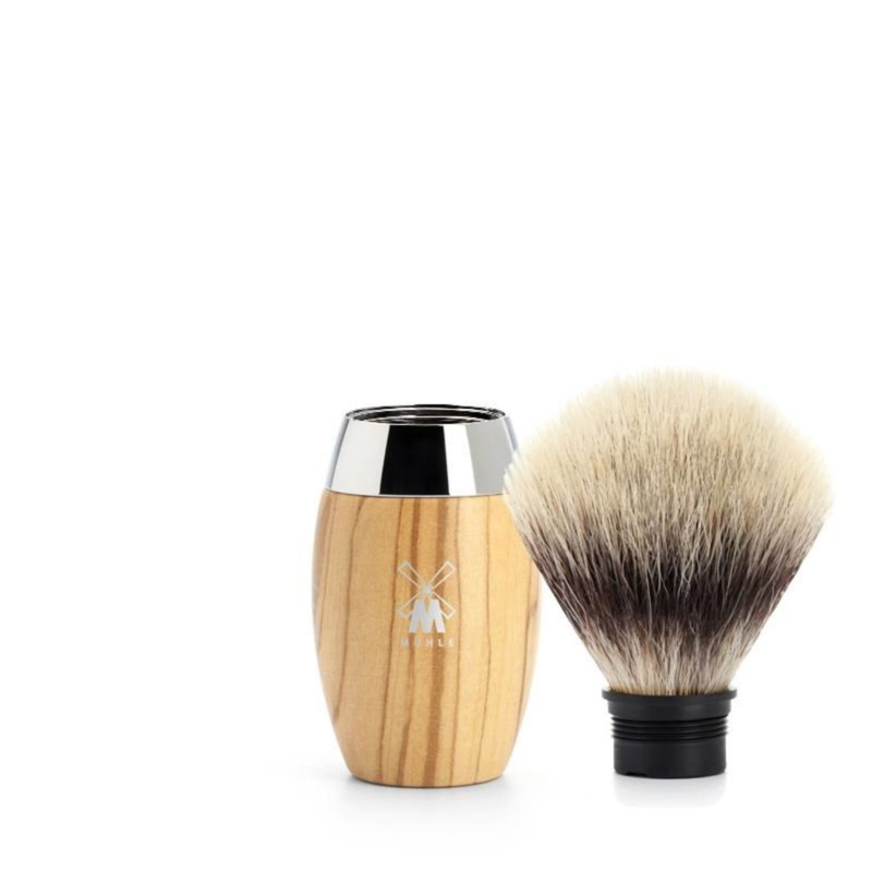 Kwast van Silvertip Fibre®. Olijfhout, serie Kosmo van MÜHLE. Olijfbomen zijn grillig van structuur en kunnen zeer oud worden, soms meer dan 300 jaar oud. Het hout heeft een fraaie tekening van lichtgeel met donkerbruine strepen en is zeer geschikt voor verwerking in luxe artikelen. Om het hout mooi te houden is het goed dit regelmatig met een olie te behandelen. Knoopdikte is 21 mm, maat M. Silvertip Fibre® - hoogwaardige synthetische vezels door MÜHLE ontwikkeld. Deze haren zijn gelijkwaardig aan de natuurlijke Silvertip das. Silvertip Vezels zijn voelbaar zacht en hebben een extreem lange levensduur. De vezel is minder kwetsbaar in het dagelijks gebruik en ze drogen sneller dan natuurlijk haar. De volledig veganistische vezels zijn zuiniger in gerbuik. Ze hebben maar slechts de helft van de hoeveelheid scheerzeep nodig om hetzelfde schuim te produceren. De haren van de kwast zijn vervangbaar door een schroefmechanisme. De kosmopoliet heeft centraal gestaan voor het ontwerp van de Kosmo-productlijn. De moderne serie met haar tijdloze ontwerp en ergonomische vormgeving is ideaal voor de goed geschoren reiziger. Mooi maar ook praktisch.