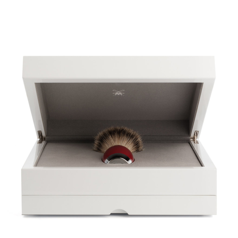 Scheerkwast Silvertip Chineese lak. Scheerkwast Slivertip XL. Kwast komt in een schitterende doos. De serie is vervaardigt volgens de originele Chineese methode "Urushi". Dit is de naam gegeven aan dit traditionele Aziatische ambacht, nu bekend als Chinese lak. Mühle past dit ambacht in dit ontwerp toe volgens dezelfde voorschriften: het in een volledig stofvrije omgeving, met de hand aanbrengen van talrijke laklagen, afgewisseld met enkele polijstprocedures. Hoe minder materiaal er gebruikt word hoe fijner en dieper de glans.