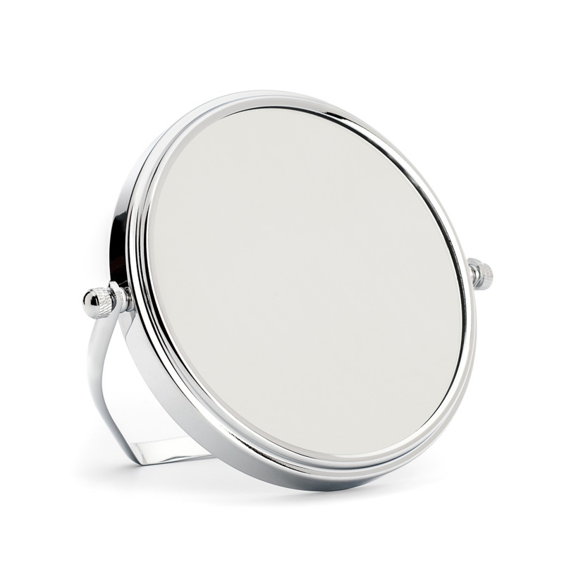 Scheerspiegel met standaard aan de achterzijde. De spiegel is verchroomd en heeft een 5x vergroting, ø 15,5 cm.