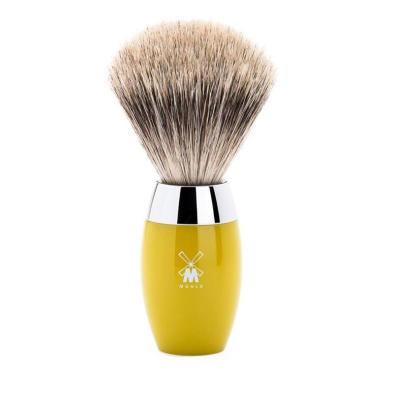 Scheerkwast van zuiver Fijndas. Geel, serie Kosmo van MÜHLE. 21 mm, maat M. De kwast is aan de top licht bijgesneden om de typische vorm van de kwast te verkrijgen. Handvat is gemaakt edelhars, een zeer duurzaam materiaal. Het bovenste gedeelte van de greep is gemaakt van messing wat eerst wordt verzinkt en vervolgens afgewerkt met chroom. Fijndas is iets stugger dan Silvertip Dassenhaar. Een onderbuik van een das bestaat uit zo’n 20 tot 25% van deze haren. Om de typische vorm te verkrijgen, wordt de kroon lichtjes bijgesneden waar nodig. Een prima haar met uitstekende prestaties. De haren van de kwast zijn vervangbaar door een schroefmechanisme. De kosmopoliet heeft centraal gestaan voor het ontwerp van de Kosmo-productlijn. De moderne serie met haar tijdloze ontwerp en ergonomische vormgeving is ideaal voor de goed geschoren reiziger. Mooi maar ook praktisch.